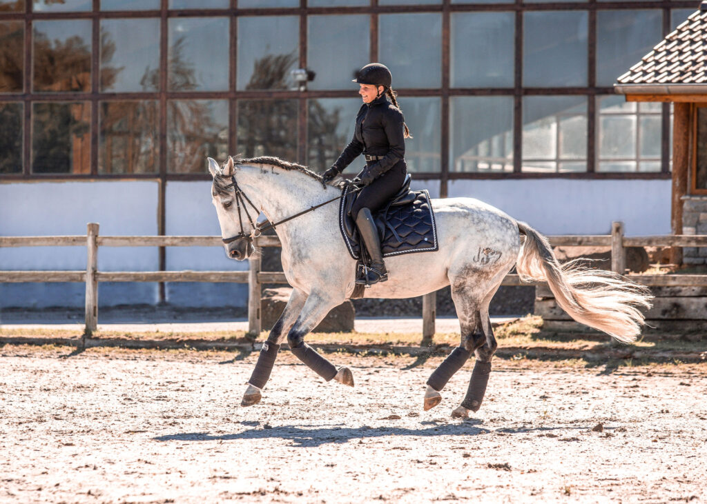 Als Rehatrainerin hilft sie Pferden vor allem beim Muskelaufbau und beim Durchbrechen alter Bewegungsmuster. Ihr Anspruch ist es, die Leichtigkeit und die Motivation bis in die hohen Lektionen beizubehalten.